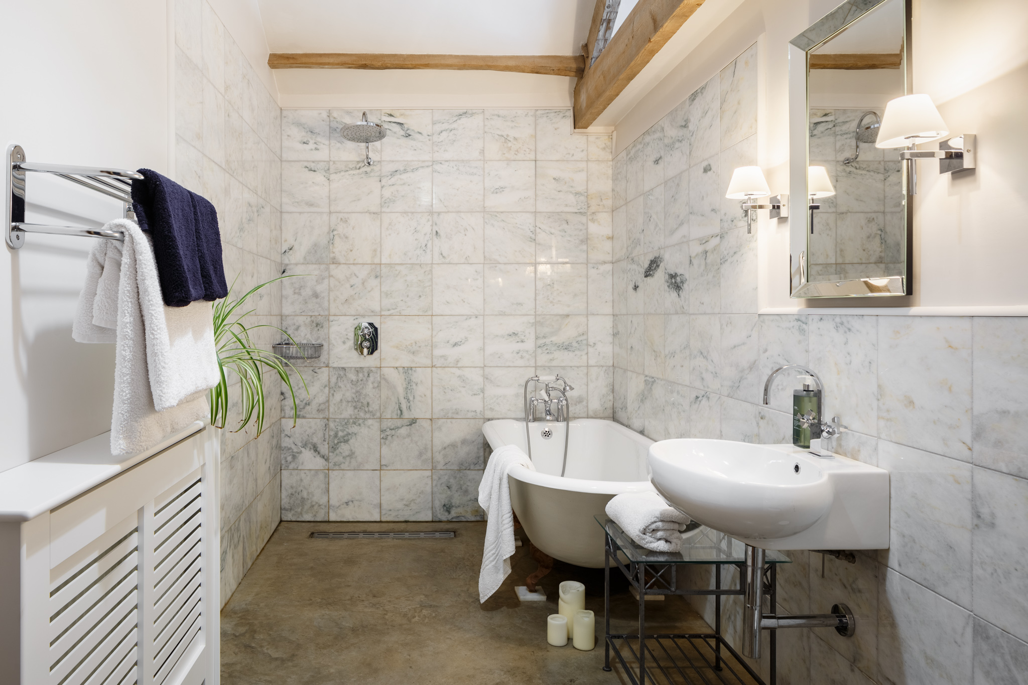 Walk in rainshower or a cast iron roll top bath in the marble tiled bathroom?